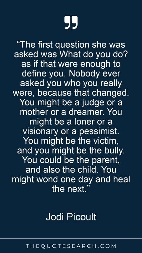 “The first question she was asked was What do you do? as if that were enough to define you. Nobody ever asked you who you really were, because that changed. You might be a judge or a mother or a dreamer. You might be a loner or a visionary or a pessimist. You might be the victim, and you might be the bully. You could be the parent, and also the child. You might wond one day and heal the next.”
