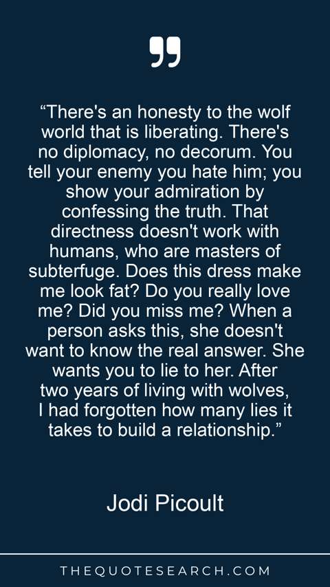 “There's an honesty to the wolf world that is liberating. There's no diplomacy, no decorum. You tell your enemy you hate him; you show your admiration by confessing the truth. That directness doesn't work with humans, who are masters of subterfuge. Does this dress make me look fat? Do you really love me? Did you miss me? When a person asks this, she doesn't want to know the real answer. She wants you to lie to her. After two years of living with wolves, I had forgotten how many lies it takes to build a relationship.”