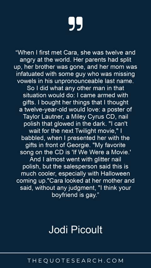 “When I first met Cara, she was twelve and angry at the world. Her parents had split up, her brother was gone, and her mom was infatuated with some guy who was missing vowels in his unpronounceable last name. So I did what any other man in that situation would do: I came armed with gifts. I bought her things that I thought a twelve-year-old would love: a poster of Taylor Lautner, a Miley Cyrus CD, nail polish that glowed in the dark. "I can't wait for the next Twilight movie," I babbled, when I presented her with the gifts in front of Georgie. "My favorite song on the CD is 'If We Were a Movie.' And I almost went with glitter nail polish, but the salesperson said this is much cooler, especially with Halloween coming up."Cara looked at her mother and said, without any judgment, "I think your boyfriend is gay.”