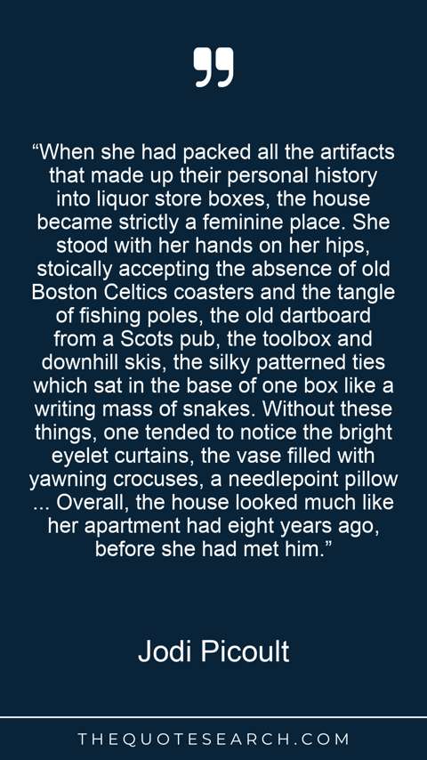 “When she had packed all the artifacts that made up their personal history into liquor store boxes, the house became strictly a feminine place. She stood with her hands on her hips, stoically accepting the absence of old Boston Celtics coasters and the tangle of fishing poles, the old dartboard from a Scots pub, the toolbox and downhill skis, the silky patterned ties which sat in the base of one box like a writing mass of snakes. Without these things, one tended to notice the bright eyelet curtains, the vase filled with yawning crocuses, a needlepoint pillow ... Overall, the house looked much like her apartment had eight years ago, before she had met him.”