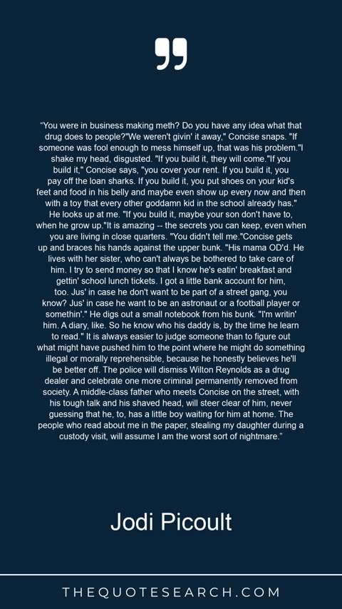 “You were in business making meth? Do you have any idea what that drug does to people?"We weren't givin' it away," Concise snaps. "If someone was fool enough to mess himself up, that was his problem."I shake my head, disgusted. "If you build it, they will come."If you build it," Concise says, "you cover your rent. If you build it, you pay off the loan sharks. If you build it, you put shoes on your kid's feet and food in his belly and maybe even show up every now and then with a toy that every other goddamn kid in the school already has." He looks up at me. "If you build it, maybe your son don't have to, when he grow up."It is amazing -- the secrets you can keep, even when you are living in close quarters. "You didn't tell me."Concise gets up and braces his hands against the upper bunk. "His mama OD'd. He lives with her sister, who can't always be bothered to take care of him. I try to send money so that I know he's eatin' breakfast and gettin' school lunch tickets. I got a little bank account for him, too. Jus' in case he don't want to be part of a street gang, you know? Jus' in case he want to be an astronaut or a football player or somethin'." He digs out a small notebook from his bunk. "I'm writin' him. A diary, like. So he know who his daddy is, by the time he learn to read." It is always easier to judge someone than to figure out what might have pushed him to the point where he might do something illegal or morally reprehensible, because he honestly believes he'll be better off. The police will dismiss Wilton Reynolds as a drug dealer and celebrate one more criminal permanently removed from society. A middle-class father who meets Concise on the street, with his tough talk and his shaved head, will steer clear of him, never guessing that he, to, has a little boy waiting for him at home. The people who read about me in the paper, stealing my daughter during a custody visit, will assume I am the worst sort of nightmare.”