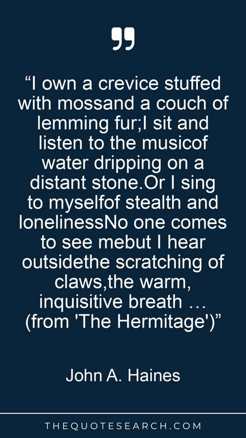 “I own a crevice stuffed with mossand a couch of lemming fur;I sit and listen to the musicof water dripping on a distant stone.Or I sing to myselfof stealth and lonelinessNo one comes to see mebut I hear outsidethe scratching of claws,the warm, inquisitive breath … (from 'The Hermitage')”