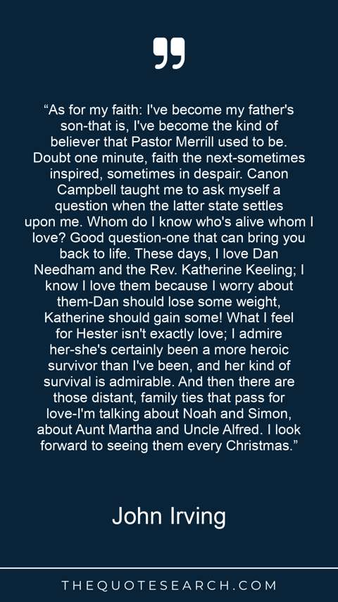 “As for my faith: I've become my father's son-that is, I've become the kind of believer that Pastor Merrill used to be. Doubt one minute, faith the next-sometimes inspired, sometimes in despair. Canon Campbell taught me to ask myself a question when the latter state settles upon me. Whom do I know who's alive whom I love? Good question-one that can bring you back to life. These days, I love Dan Needham and the Rev. Katherine Keeling; I know I love them because I worry about them-Dan should lose some weight, Katherine should gain some! What I feel for Hester isn't exactly love; I admire her-she's certainly been a more heroic survivor than I've been, and her kind of survival is admirable. And then there are those distant, family ties that pass for love-I'm talking about Noah and Simon, about Aunt Martha and Uncle Alfred. I look forward to seeing them every Christmas.”