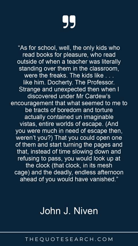 “As for school, well, the only kids who read books for pleasure, who read outside of when a teacher was literally standing over them in the classroom, were the freaks. The kids like . . . like him. Docherty. The Professor. Strange and unexpected then when I discovered under Mr Cardew’s encouragement that what seemed to me to be tracts of boredom and torture actually contained un imaginable vistas, entire worlds of escape. (And you were much in need of escape then, weren’t you?) That you could open one of them and start turning the pages and that, instead of time slowing down and refusing to pass, you would look up at the clock (that clock, in its mesh cage) and the deadly, endless afternoon ahead of you would have vanished.”