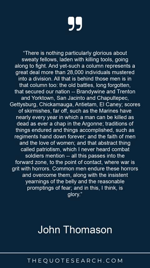 “There is nothing particularly glorious about sweaty fellows, laden with killing tools, going along to fight. And yet-such a column represents a great deal more than 28,000 individuals mustered into a division. All that is behind those men is in that column too: the old battles, long forgotten, that secured our nation -- Brandywine and Trenton and Yorktown, San Jacinto and Chapultepec, Gettysburg, Chickamauga, Antietam, El Caney; scores of skirmishes, far off, such as the Marines have nearly every year in which a man can be killed as dead as ever a chap in the Argonne; traditions of things endured and things accomplished, such as regiments hand down forever; and the faith of men and the love of women; and that abstract thing called patriotism, which I never heard combat soldiers mention -- all this passes into the forward zone, to the point of contact, where war is grit with horrors. Common men endure these horrors and overcome them, along with the insistent yearnings of the belly and the reasonable promptings of fear; and in this, I think, is glory.”