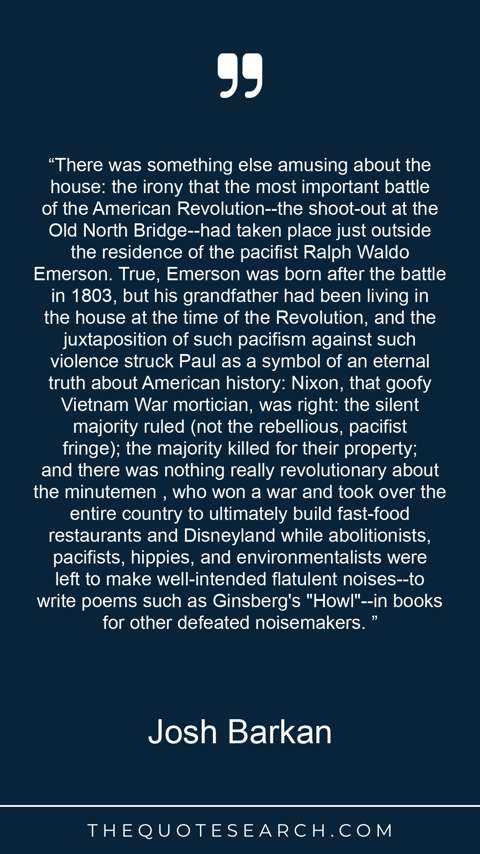 “There was something else amusing about the house: the irony that the most important battle of the American Revolution--the shoot-out at the Old North Bridge--had taken place just outside the residence of the pacifist Ralph Waldo Emerson. True, Emerson was born after the battle in 1803, but his grandfather had been living in the house at the time of the Revolution, and the juxtaposition of such pacifism against such violence struck Paul as a symbol of an eternal truth about American history: Nixon, that goofy Vietnam War mortician, was right: the silent majority ruled (not the rebellious, pacifist fringe); the majority killed for their property; and there was nothing really revolutionary about the minutemen , who won a war and took over the entire country to ultimately build fast-food restaurants and Disneyland while abolitionists, pacifists, hippies, and environmentalists were left to make well-intended flatulent noises--to write poems such as Ginsberg's "Howl"--in books for other defeated noisemakers. ”