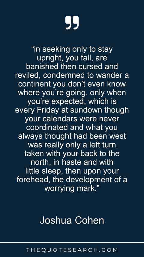 “in seeking only to stay upright, you fall, are banished then cursed and reviled, condemned to wander a continent you don’t even know where you’re going, only when you’re expected, which is every Friday at sundown though your calendars were never coordinated and what you always thought had been west was really only a left turn taken with your back to the north, in haste and with little sleep, then upon your forehead, the development of a worrying mark.”