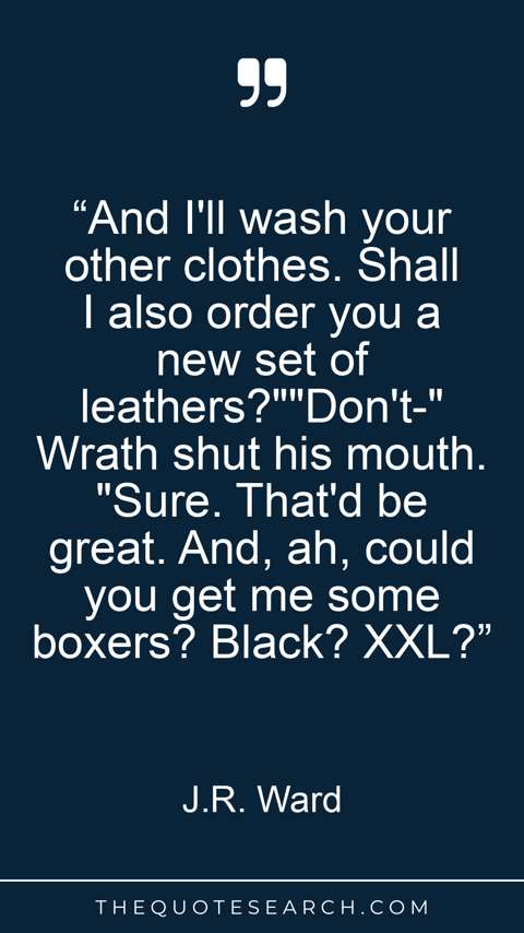 “Wrath walked over to the closet and looked throught the clothes. He took out a black long-sleeved shirt, a pair of leather pants, and --jeez, what was this? Oh, not fucking likely. He was not going to fight in BVDs. He'd go commando before he got cought dead inthose things.”
