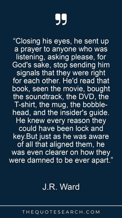 “Closing his eyes, he sent up a prayer to anyone who was listening, asking please, for God's sake, stop sending him signals that they were right for each other. He'd read that book, seen the movie, bought the soundtrack, the DVD, the T-shirt, the mug, the bobble-head, and the insider's guide. He knew every reason they could have been lock and key.But just as he was aware of all that aligned them, he was even clearer on how they were damned to be ever apart.”