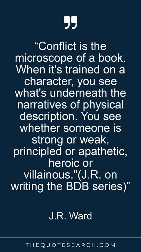 “Conflict is the microscope of a book. When it's trained on a character, you see what's underneath the narratives of physical description. You see whether someone is strong or weak, principled or apathetic, heroic or villainous."(J.R. on writing the BDB series)”