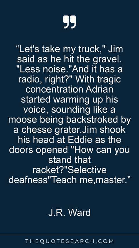 “Let's take my truck," Jim said as he hit the gravel. "Less noise."And it has a radio, right?" With tragic concentration Adrian started warming up his voice, sounding like a moose being backstroked by a chesse grater.Jim shook his head at Eddie as the doors opened "How can you stand that racket?"Selective deafness"Teach me,master.”