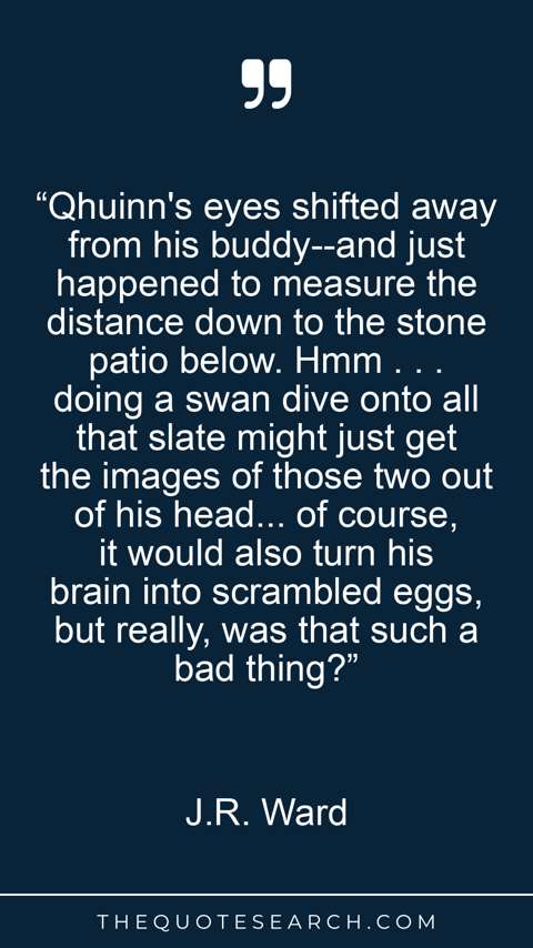 “Qhuinn's eyes shifted away from his buddy--and just happened to measure the distance down to the stone patio below. Hmm . . . doing a swan dive onto all that slate might just get the images of those two out of his head... of course, it would also turn his brain into scrambled eggs, but really, was that such a bad thing?”