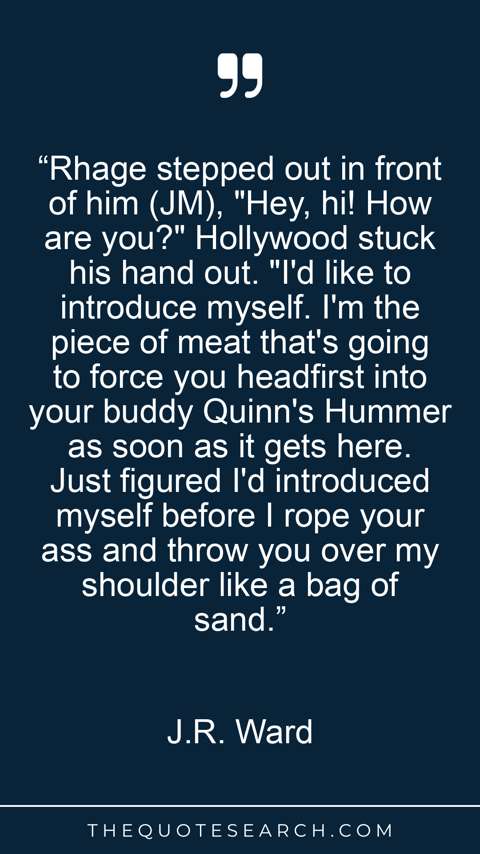 “Rhage stepped out in front of him (JM), "Hey, hi! How are you?" Hollywood stuck his hand out. "I'd like to introduce myself. I'm the piece of meat that's going to force you headfirst into your buddy Quinn's Hummer as soon as it gets here. Just figured I'd introduced myself before I rope your ass and throw you over my shoulder like a bag of sand.”