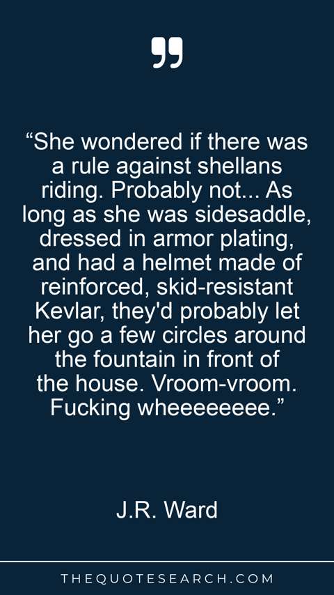 “She wondered if there was a rule against shellans riding. Probably not... As long as she was sidesaddle, dressed in armor plating, and had a helmet made of reinforced, skid-resistant Kevlar, they'd probably let her go a few circles around the fountain in front of the house. Vroom-vroom. Fucking wheeeeeeee.”