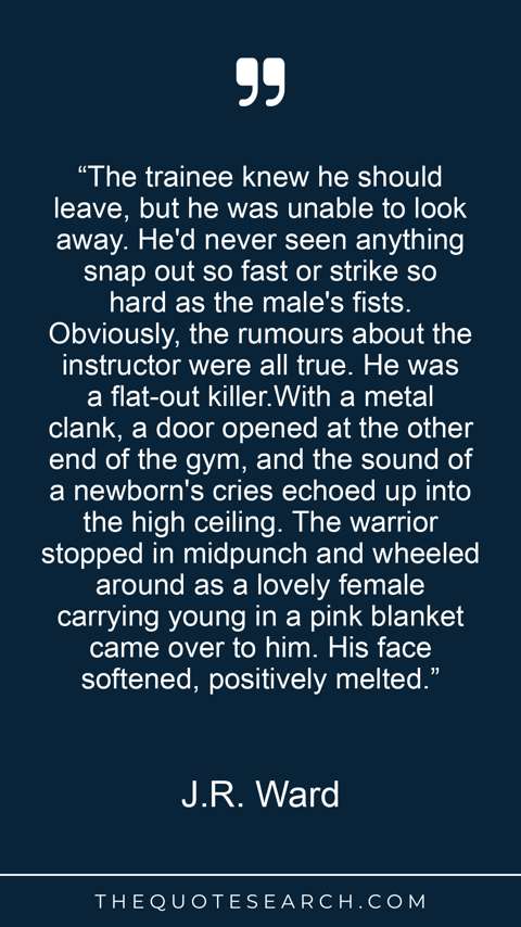 “The trainee knew he should leave, but he was unable to look away. He'd never seen anything snap out so fast or strike so hard as the male's fists. Obviously, the rumours about the instructor were all true. He was a flat-out killer.With a metal clank, a door opened at the other end of the gym, and the sound of a newborn's cries echoed up into the high ceiling. The warrior stopped in midpunch and wheeled around as a lovely female carrying young in a pink blanket came over to him. His face softened, positively melted.”