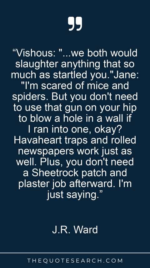 “Vishous: "...we both would slaughter anything that so much as startled you."Jane: "I'm scared of mice and spiders. But you don't need to use that gun on your hip to blow a hole in a wall if I ran into one, okay? Havaheart traps and rolled newspapers work just as well. Plus, you don't need a Sheetrock patch and plaster job afterward. I'm just saying.”