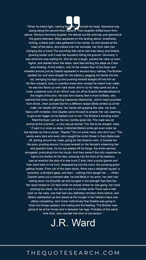 “When he heard light, rushing footfalls, he turned his head. Someone was racing along the second-floor balcony. Then laughter drifted down from above. Glorious feminine laughter. He leaned out the archway and glanced at the grand staircase. Bella appeared on the landing above, breathless, smiling, a black satin robe gathered in her hands. As she slowed at the head of the stairs, she looked over her shoulder, her thick dark hair swinging like a mane.The pounding that came next was heavy and distant, growing louder until it was like boulders hitting the ground. Obviously, it was what she was waiting for. She let out a laugh, yanked her robe up even higher, and started down the stairs, bare feet skirting the steps as if she were floating. At the bottom, she hit the mosaic floor of the foyer and wheeled around just as Zsadist appeared in second-story hallway.The Brother spotted her and went straight for the balcony, pegging his hands into the rail, swinging his legs up and pushing himself straight off into thin air. He flew outward, body in a perfect swan dive--except he wasn't over water, he was two floors up over hard stone.John's cry for help came out as a mute, sustained rush of air--Which was cut off as Zsadist dematerialized at the height of the dive. He took form twenty feet in front of Bella, who watched the show with glowing happiness.Meanwhile, John's heart pounded from shock...then pumped fast for a different reason.Bella smiled up at her mate, her breath still hard, her hands still gripping the robe, her eyes heavy with invitation. And Zsadist came forward to answer her call, seeming to get even bigger as he stalked over to her. The Brother's bonding scent filled the foyer, just as his low, lionlike growl did. The male was all animal at the moment....a very sexual animal."You like to be chased, nalla, " Z said in a voice so deep it distorted.Bella's smile got even wider as she backed up into a corner. "Maybe.""So run some more, why don't you." The words were dark and even John caught the erotic threat in them.Bella took off, darting around her mate, going for the billiards room. Z tracked her like prey, pivoting around, his eyes leveled on the female's streaming hair and graceful body. As his lips peeled off his fangs, the white canines elongated, protruding from his mouth. And they weren't the only response he had to his shellan.At his hips, pressing into the front of his leathers, was an erection the size of a tree trunk.Z shot John a quick glance and then went back to his hunt, disappearing into the room, the pumping growl getting louder. From out of the open doors, there was a delighted squeal, a scramble, a female's gasp, and then....nothing.He'd caught her.......When Zsadist came out a moment later, he had Bella in his arms, her dark hair trailing down his shoulder as she lounged in the strength that held her. Her eyes locked on Z's face while he looked where he was going, her hand stroking his chest, her lips curved in a private smile.There was a bite mark on her neck, one that had very definitely not been there before, and Bella's satisfaction as she stared at the hunger in her hellren's face was utterly compelling. John knew instinctively that Zsadist was going to finish two things upstairs: the mating and the feeding. The Brother was going to be at her throat and in between her legs. Probably at the same time.God, John wanted that kind of connection.”