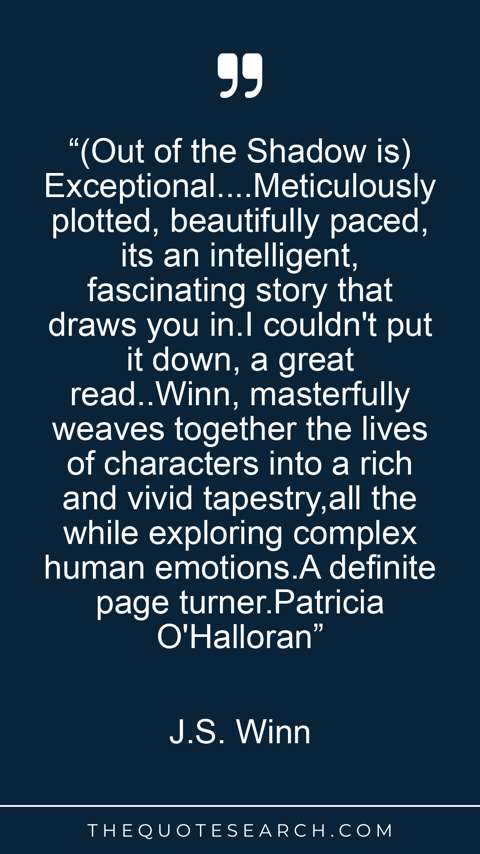“(Out of the Shadow is) Exceptional....Meticulously plotted, beautifully paced, its an intelligent, fascinating story that draws you in.I couldn't put it down, a great read..Winn, masterfully weaves together the lives of characters into a rich and vivid tapestry,all the while exploring complex human emotions.A definite page turner.Patricia O'Halloran”