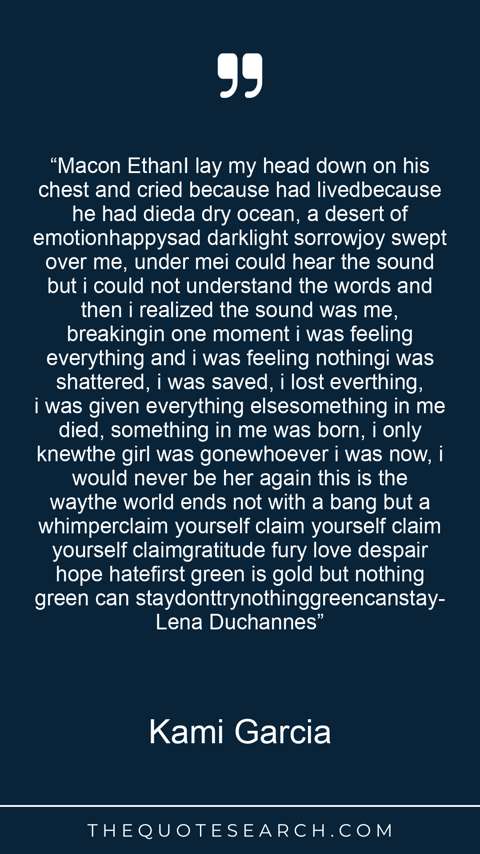“Macon EthanI lay my head down on his chest and cried because had livedbecause he had dieda dry ocean, a desert of emotionhappysad darklight sorrowjoy swept over me, under mei could hear the sound but i could not understand the words and then i realized the sound was me, breakingin one moment i was feeling everything and i was feeling nothingi was shattered, i was saved, i lost everthing, i was given everything elsesomething in me died, something in me was born, i only knewthe girl was gonewhoever i was now, i would never be her again this is the waythe world ends not with a bang but a whimperclaim yourself claim yourself claim yourself claimgratitude fury love despair hope hatefirst green is gold but nothing green can staydonttrynothinggreencanstay-Lena Duchannes”
