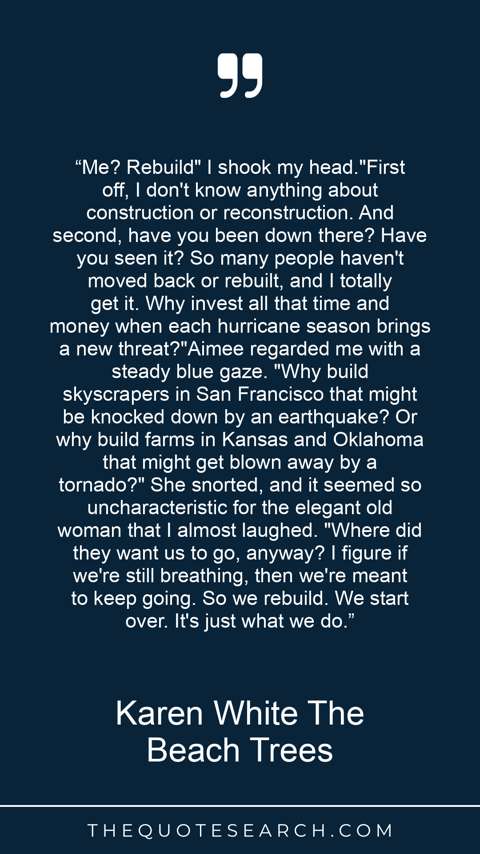 “Me? Rebuild" I shook my head."First off, I don't know anything about construction or reconstruction. And second, have you been down there? Have you seen it? So many people haven't moved back or rebuilt, and I totally get it. Why invest all that time and money when each hurricane season brings a new threat?"Aimee regarded me with a steady blue gaze. "Why build skyscrapers in San Francisco that might be knocked down by an earthquake? Or why build farms in Kansas and Oklahoma that might get blown away by a tornado?" She snorted, and it seemed so uncharacteristic for the elegant old woman that I almost laughed. "Where did they want us to go, anyway? I figure if we're still breathing, then we're meant to keep going. So we rebuild. We start over. It's just what we do.”
