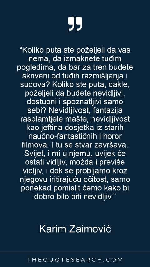 “Koliko puta ste poželjeli da vas nema, da izmaknete tuđim pogledima, da bar za tren budete skriveni od tuđih razmišljanja i sudova? Koliko ste puta, dakle, poželjeli da budete nevidljivi, dostupni i spoznatljivi samo sebi? Nevidljivost, fantazija rasplamtjele mašte, nevidljivost kao jeftina dosjetka iz starih naučno-fantastičnih i horor filmova. I tu se stvar završava. Svijet, i mi u njemu, uvijek će ostati vidljiv, možda i previše vidljiv, i dok se probijamo kroz njegovu iritirajuću očitost, samo ponekad pomislit ćemo kako bi dobro bilo biti nevidljiv.”