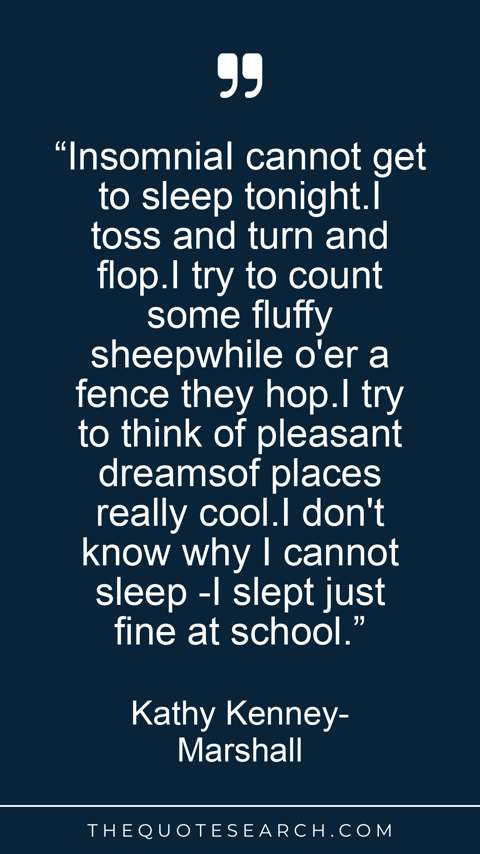 “InsomniaI cannot get to sleep tonight.I toss and turn and flop.I try to count some fluffy sheepwhile o'er a fence they hop.I try to think of pleasant dreamsof places really cool.I don't know why I cannot sleep -I slept just fine at school.”