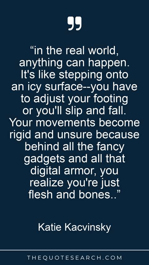 “in the real world, anything can happen. It's like stepping onto an icy surface--you have to adjust your footing or you'll slip and fall. Your movements become rigid and unsure because behind all the fancy gadgets and all that digital armor, you realize you're just flesh and bones..”