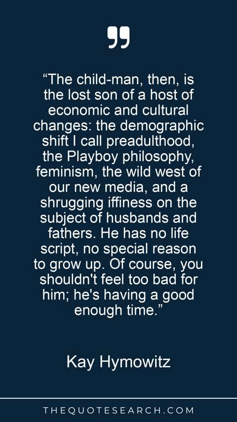 “The child-man, then, is the lost son of a host of economic and cultural changes: the demographic shift I call preadulthood, the Playboy philosophy, feminism, the wild west of our new media, and a shrugging iffiness on the subject of husbands and fathers. He has no life script, no special reason to grow up. Of course, you shouldn't feel too bad for him; he's having a good enough time.”