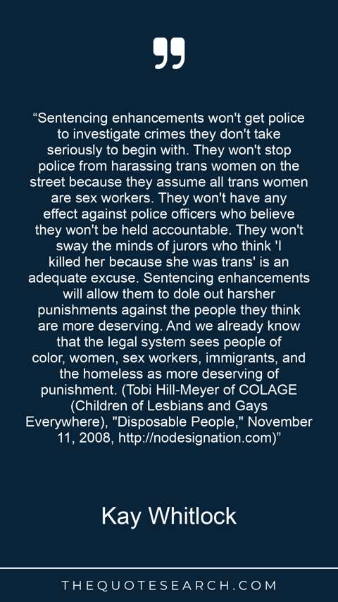 “Sentencing enhancements won't get police to investigate crimes they don't take seriously to begin with. They won't stop police from harassing trans women on the street because they assume all trans women are sex workers. They won't have any effect against police officers who believe they won't be held accountable. They won't sway the minds of jurors who think 'I killed her because she was trans' is an adequate excuse. Sentencing enhancements will allow them to dole out harsher punishments against the people they think are more deserving. And we already know that the legal system sees people of color, women, sex workers, immigrants, and the homeless as more deserving of punishment. (Tobi Hill-Meyer of COLAGE (Children of Lesbians and Gays Everywhere), "Disposable People," November 11, 2008, http://nodesignation.com)”