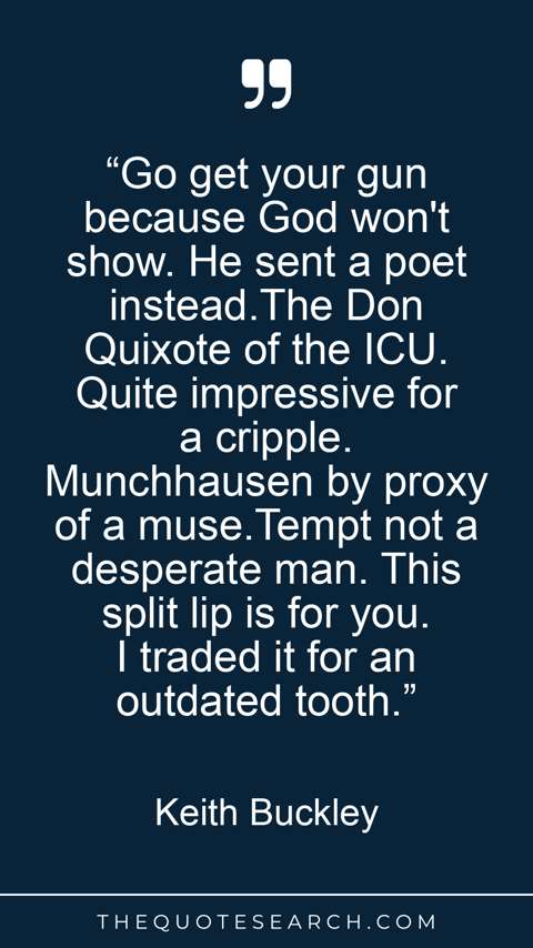 “Go get your gun because God won't show. He sent a poet instead.The Don Quixote of the ICU. Quite impressive for a cripple. Munchhausen by proxy of a muse.Tempt not a desperate man. This split lip is for you. I traded it for an outdated tooth.”