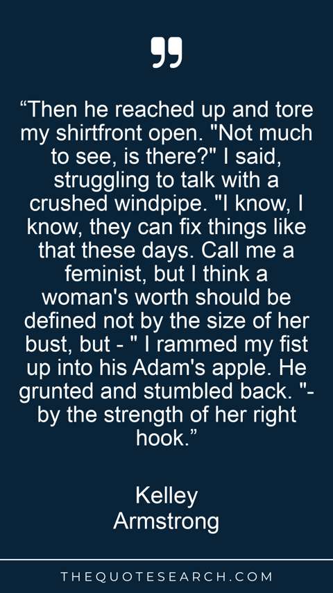 “Then he reached up and tore my shirtfront open. "Not much to see, is there?" I said, struggling to talk with a crushed windpipe. "I know, I know, they can fix things like that these days. Call me a feminist, but I think a woman's worth should be defined not by the size of her bust, but - " I rammed my fist up into his Adam's apple. He grunted and stumbled back. "- by the strength of her right hook.”