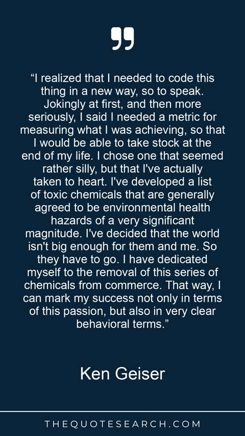 “I realized that I needed to code this thing in a new way, so to speak. Jokingly at first, and then more seriously, I said I needed a metric for measuring what I was achieving, so that I would be able to take stock at the end of my life. I chose one that seemed rather silly, but that I've actually taken to heart. I've developed a list of toxic chemicals that are generally agreed to be environmental health hazards of a very significant magnitude. I've decided that the world isn't big enough for them and me. So they have to go. I have dedicated myself to the removal of this series of chemicals from commerce. That way, I can mark my success not only in terms of this passion, but also in very clear behavioral terms.”