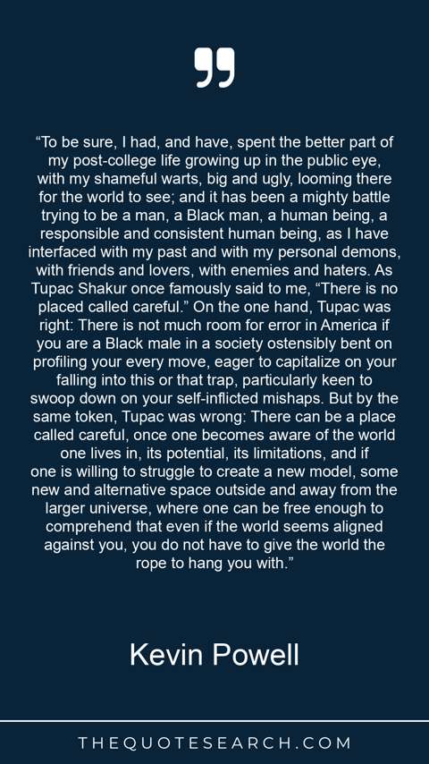 “To be sure, I had, and have, spent the better part of my post-college life growing up in the public eye, with my shameful warts, big and ugly, looming there for the world to see; and it has been a mighty battle trying to be a man, a Black man, a human being, a responsible and consistent human being, as I have interfaced with my past and with my personal demons, with friends and lovers, with enemies and haters. As Tupac Shakur once famously said to me, “There is no placed called careful.” On the one hand, Tupac was right: There is not much room for error in America if you are a Black male in a society ostensibly bent on profiling your every move, eager to capitalize on your falling into this or that trap, particularly keen to swoop down on your self-inflicted mishaps. But by the same token, Tupac was wrong: There can be a place called careful, once one becomes aware of the world one lives in, its potential, its limitations, and if one is willing to struggle to create a new model, some new and alternative space outside and away from the larger universe, where one can be free enough to comprehend that even if the world seems aligned against you, you do not have to give the world the rope to hang you with.”