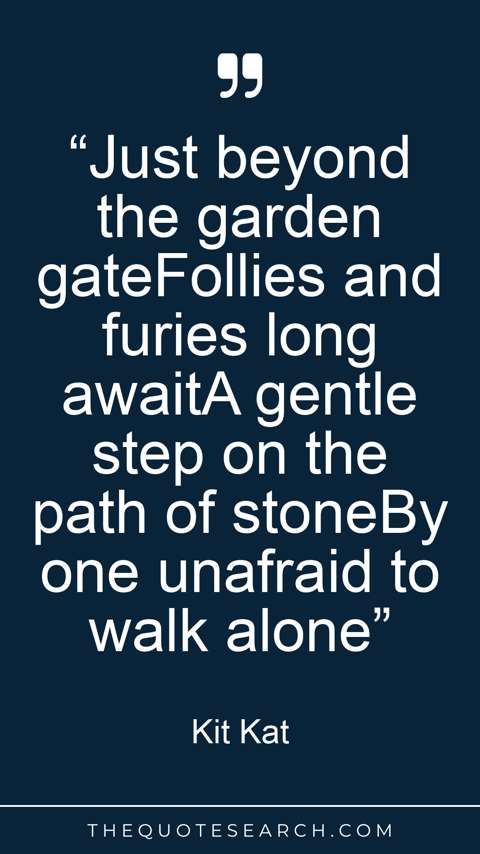 “Just beyond the garden gateFollies and furies long awaitA gentle step on the path of stoneBy one unafraid to walk alone”