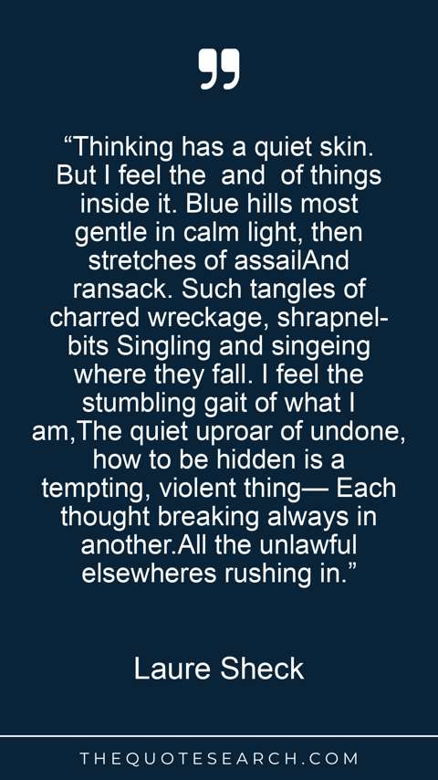 “Thinking has a quiet skin. But I feel the and of things inside it. Blue hills most gentle in calm light, then stretches of assailAnd ransack. Such tangles of charred wreckage, shrapnel-bits Singling and singeing where they fall. I feel the stumbling gait of what I am,The quiet uproar of undone, how to be hidden is a tempting, violent thing— Each thought breaking always in another.All the unlawful elsewheres rushing in.”
