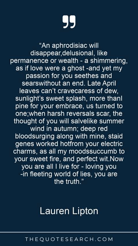 “An aphrodisiac will disappear,delusional, like permanence or wealth - a shimmering, as if love were a ghost -and yet my passion for you seethes and searswithout an end. Late April leaves can’t cravecaress of dew, sunlight’s sweet splash, more thanI pine for your embrace, us turned to one;when harsh reversals scar, the thought of you will salvelike summer wind in autumn; deep red bloodsurging along with mine, staid genes worked hotfrom your electric charms, as all my moodssuccumb to your sweet fire, and perfect wit.Now you are all I live for - loving you -in fleeting world of lies, you are the truth.”
