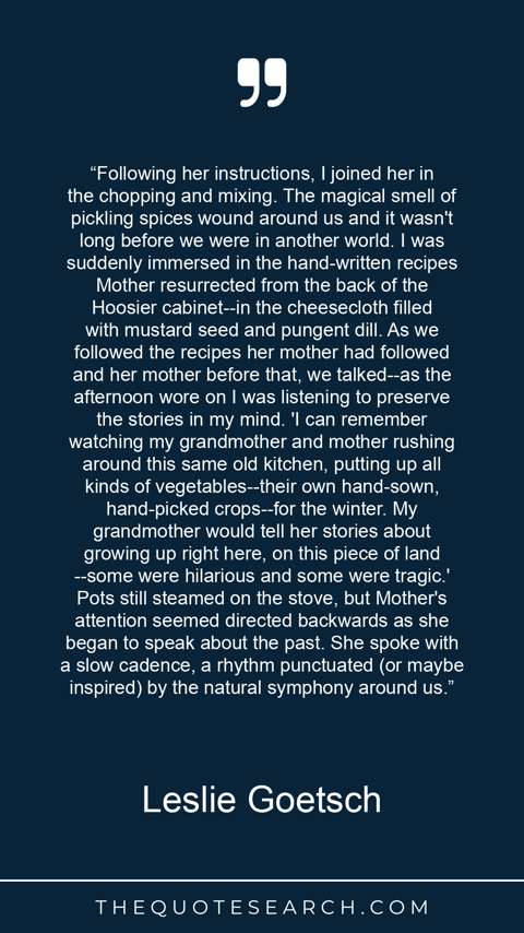 “Following her instructions, I joined her in the chopping and mixing. The magical smell of pickling spices wound around us and it wasn't long before we were in another world. I was suddenly immersed in the hand-written recipes Mother resurrected from the back of the Hoosier cabinet--in the cheesecloth filled with mustard seed and pungent dill. As we followed the recipes her mother had followed and her mother before that, we talked--as the afternoon wore on I was listening to preserve the stories in my mind. 'I can remember watching my grandmother and mother rushing around this same old kitchen, putting up all kinds of vegetables--their own hand-sown, hand-picked crops--for the winter. My grandmother would tell her stories about growing up right here, on this piece of land--some were hilarious and some were tragic.' Pots still steamed on the stove, but Mother's attention seemed directed backwards as she began to speak about the past. She spoke with a slow cadence, a rhythm punctuated (or maybe inspired) by the natural symphony around us.”