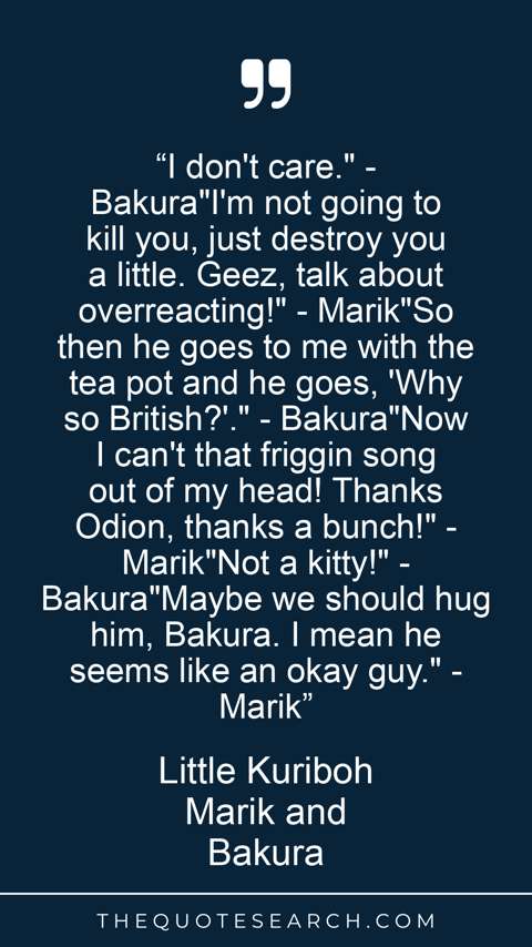 “I don't care." - Bakura"I'm not going to kill you, just destroy you a little. Geez, talk about overreacting!" - Marik"So then he goes to me with the tea pot and he goes, 'Why so British?'." - Bakura"Now I can't that friggin song out of my head! Thanks Odion, thanks a bunch!" - Marik"Not a kitty!" - Bakura"Maybe we should hug him, Bakura. I mean he seems like an okay guy." - Marik”