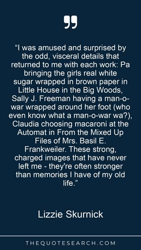 “I was amused and surprised by the odd, visceral details that returned to me with each work: Pa bringing the girls real white sugar wrapped in brown paper in Little House in the Big Woods, Sally J. Freeman having a man-o-war wrapped around her foot (who even know what a man-o-war wa?), Claudia choosing macaroni at the Automat in From the Mixed Up Files of Mrs. Basil E. Frankweiler. These strong, charged images that have never left me - they're often stronger than memories I have of my old life.”