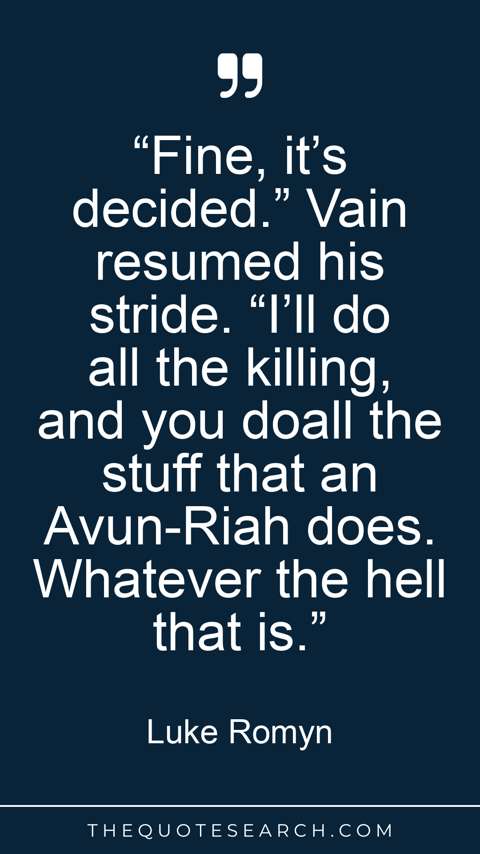 “Fine, it’s decided.” Vain resumed his stride. “I’ll do all the killing, and you doall the stuff that an Avun-Riah does. Whatever the hell that is.”