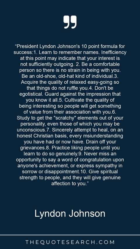 “President Lyndon Johnson's 10 point formula for success:1. Learn to remember names. Inefficiency at this point may indicate that your interest is not sufficiently outgoing. 2. Be a comfortable person so there is no strain in being with you. Be an old-shoe, old-hat kind of individual.3. Acquire the quality of relaxed easy-going so that things do not ruffle you.4. Don't be egotistical. Guard against the impression that you know it all.5. Cultivate the quality of being interesting so people will get something of value from their association with you.6. Study to get the "scratchy" elements out of your personality, even those of which you may be unconscious.7. Sincerely attempt to heal, on an honest Christian basis, every msiunderstanding you have had or now have. Drain off your grievances.8. Practice liking people until you learn to do so genuinely.9. Never miss an opportunity to say a word of congratulation upon anyone's achievement, or express sympathy in sorrow or disappointment.10. Give spiritual strength to people, and they will give genuine affection to you.”