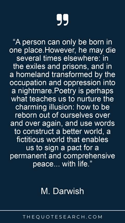 “A person can only be born in one place.However, he may die several times elsewhere: in the exiles and prisons, and in a homeland transformed by the occupation and oppression into a nightmare.Poetry is perhaps what teaches us to nurture the charming illusion: how to be reborn out of ourselves over and over again, and use words to construct a better world, a fictitious world that enables us to sign a pact for a permanent and comprehensive peace... with life.”