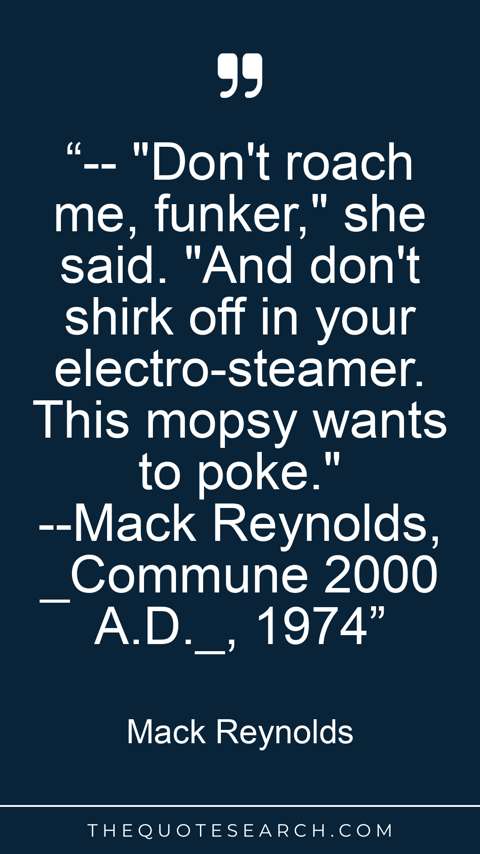 “-- "Don't roach me, funker," she said. "And don't shirk off in your electro-steamer. This mopsy wants to poke." --Mack Reynolds, _Commune 2000 A.D._, 1974”