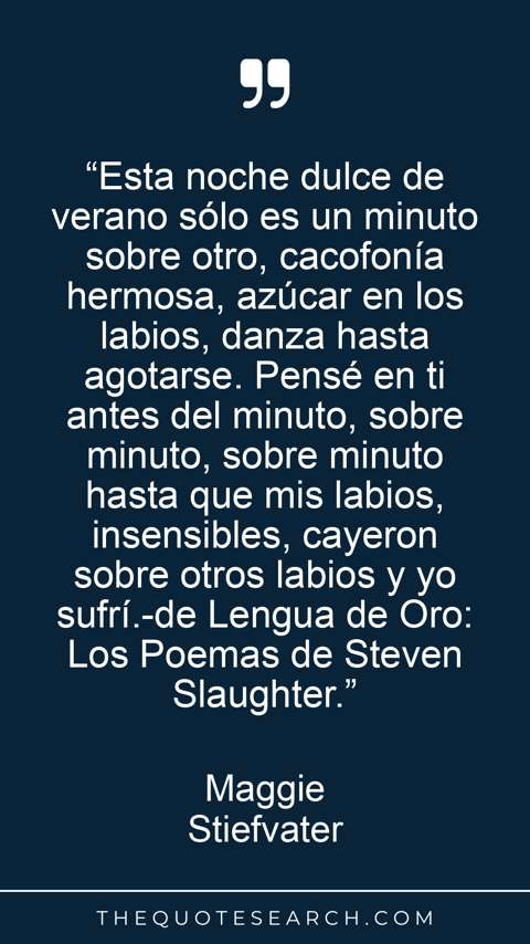 “Esta noche dulce de verano sólo es un minuto sobre otro, cacofonía hermosa, azúcar en los labios, danza hasta agotarse. Pensé en ti antes del minuto, sobre minuto, sobre minuto hasta que mis labios, insensibles, cayeron sobre otros labios y yo sufrí.-de Lengua de Oro: Los Poemas de Steven Slaughter.”