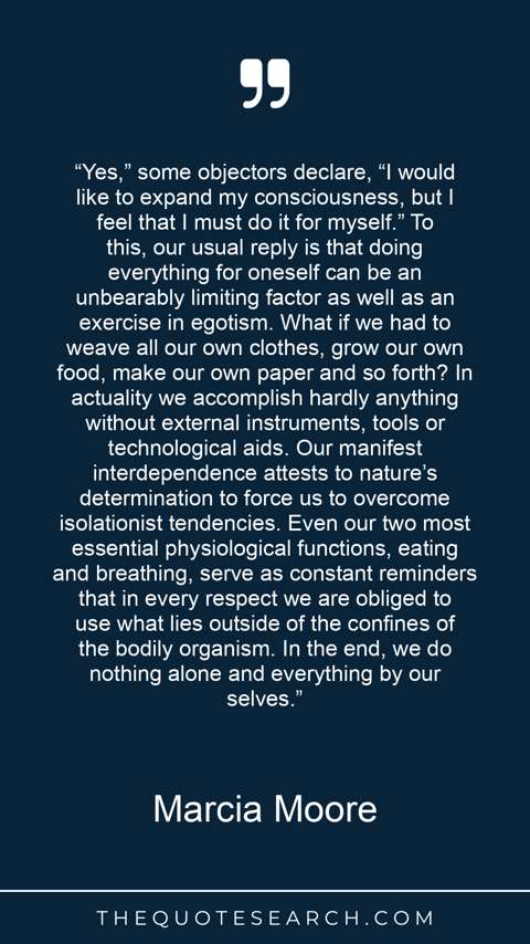 “Yes,” some objectors declare, “I would like to expand my consciousness, but I feel that I must do it for myself.” To this, our usual reply is that doing everything for oneself can be an unbearably limiting factor as well as an exercise in egotism. What if we had to weave all our own clothes, grow our own food, make our own paper and so forth? In actuality we accomplish hardly anything without external instruments, tools or technological aids. Our manifest interdependence attests to nature’s determination to force us to overcome isolationist tendencies. Even our two most essential physiological functions, eating and breathing, serve as constant reminders that in every respect we are obliged to use what lies outside of the confines of the bodily organism. In the end, we do nothing alone and everything by our selves.”