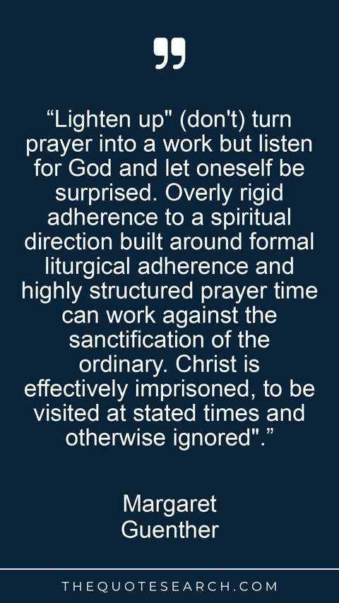 “Lighten up" (don't) turn prayer into a work but listen for God and let oneself be surprised. Overly rigid adherence to a spiritual direction built around formal liturgical adherence and highly structured prayer time can work against the sanctification of the ordinary. Christ is effectively imprisoned, to be visited at stated times and otherwise ignored".”