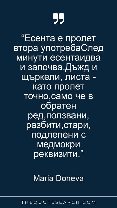“Есента е пролет втора употребаСлед минути есентаидва и започва.Дъжд и щъркели, листа - като пролет точно,само че в обратен ред,ползвани, разбити,стари, подлепени с медмокри реквизити.”