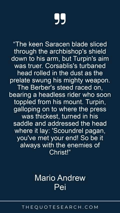 “The keen Saracen blade sliced through the archbishop's shield down to his arm, but Turpin's aim was truer. Corsablis's turbaned head rolled in the dust as the prelate swung his mighty weapon. The Berber's steed raced on, bearing a headless rider who soon toppled from his mount. Turpin, galloping on to where the press was thickest, turned in his saddle and addressed the head where it lay: 'Scoundrel pagan, you've met your end! So be it always with the enemies of Christ!”