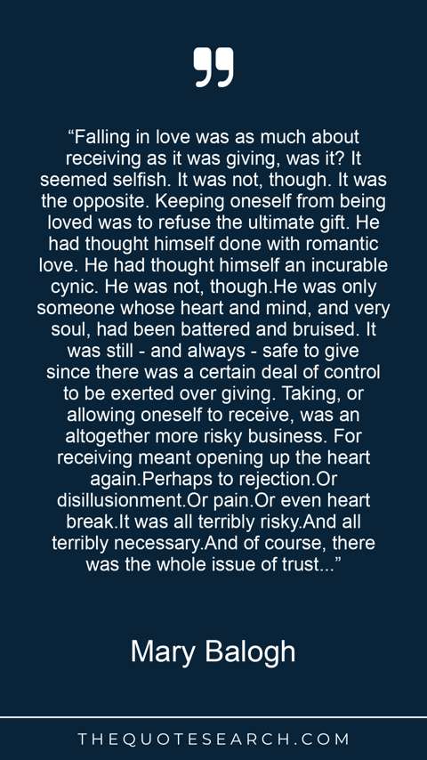 “Falling in love was as much about receiving as it was giving, was it? It seemed selfish. It was not, though. It was the opposite. Keeping oneself from being loved was to refuse the ultimate gift. He had thought himself done with romantic love. He had thought himself an incurable cynic. He was not, though.He was only someone whose heart and mind, and very soul, had been battered and bruised. It was still - and always - safe to give since there was a certain deal of control to be exerted over giving. Taking, or allowing oneself to receive, was an altogether more risky business. For receiving meant opening up the heart again.Perhaps to rejection.Or disillusionment.Or pain.Or even heart break.It was all terribly risky.And all terribly necessary.And of course, there was the whole issue of trust...”