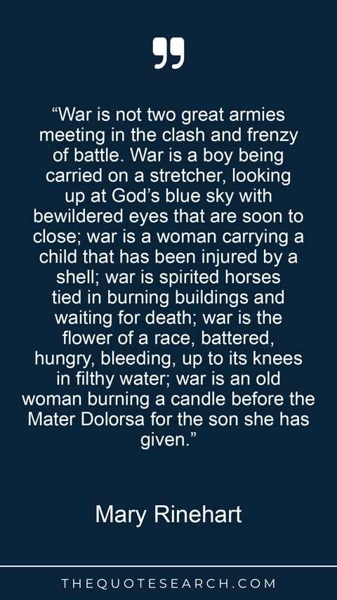 In this quote by Mary Rinehart, the vivid imagery paints a powerful picture of the true horrors of war. The examples provided show the devastating impact of war on individuals, families, and entire nations.